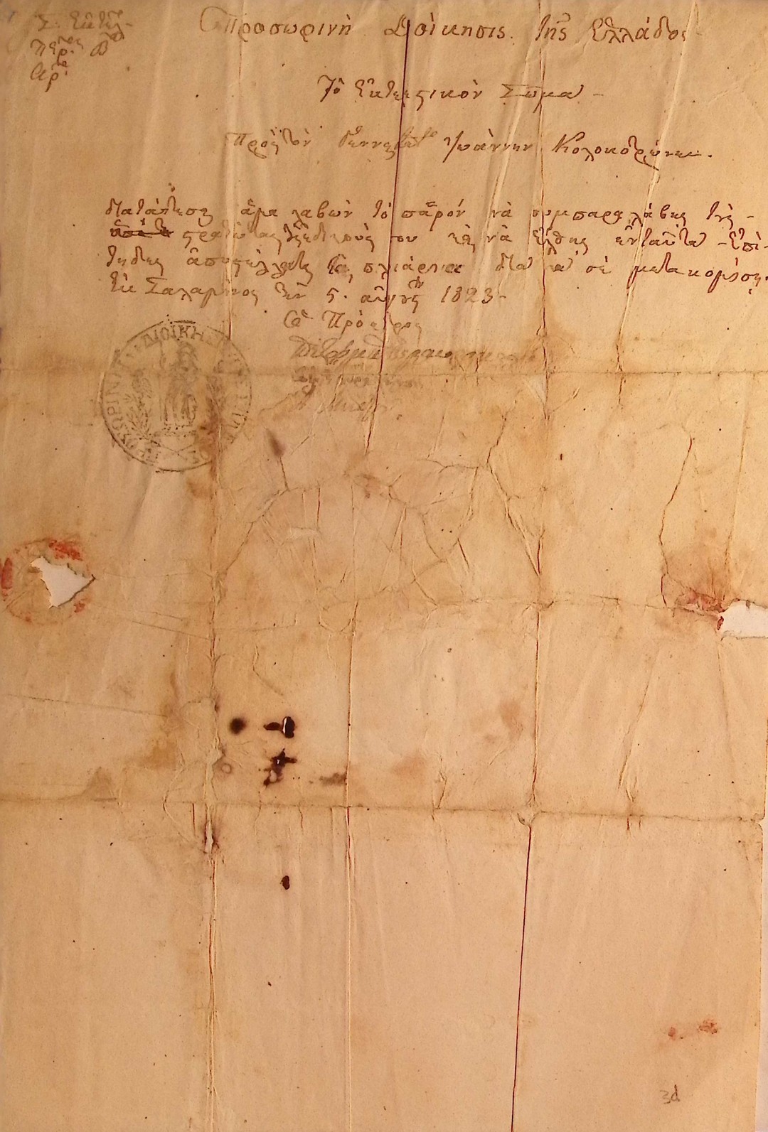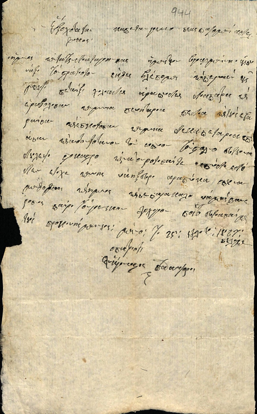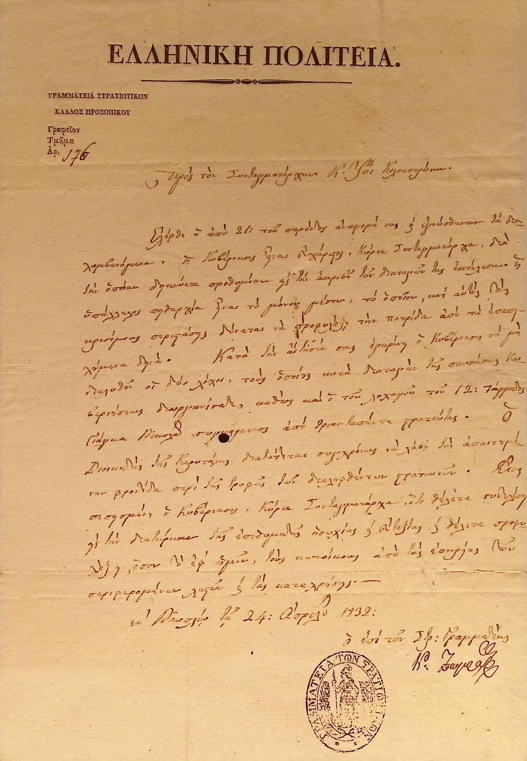 | Τίτλος | Επιστολή Προέδρου Εκτελεστικού Πετρόμπεη Μαυρομιχάλη προς Ιωάννη Θ.Κολοκοτρώνη (Γενναίο) περί εκτέλεσης διαταγών |