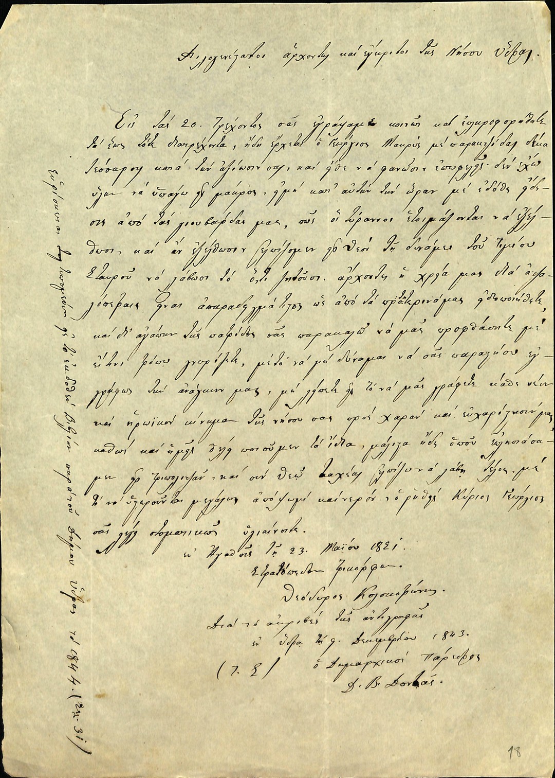 | Τίτλος | Επιστολή του Αρχιμανδρίτη Γρηγόριου Δικαίου (Παπαφλέσσα), Θεόδωρου Κολοκοτρώνη κ.α προς πρόκριτους Ύδρας και Σπετσών |