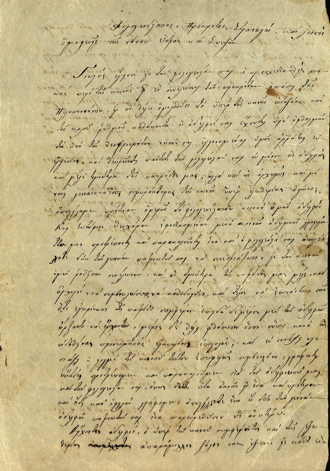 | Τίτλος | Επιστολή προυχόντων Αχαΐας προς τους Άρχοντες Ύδρας και Σπετσών σχετικά με διαρροή πληροφοριών της Φιλικής Εταιρείας. |