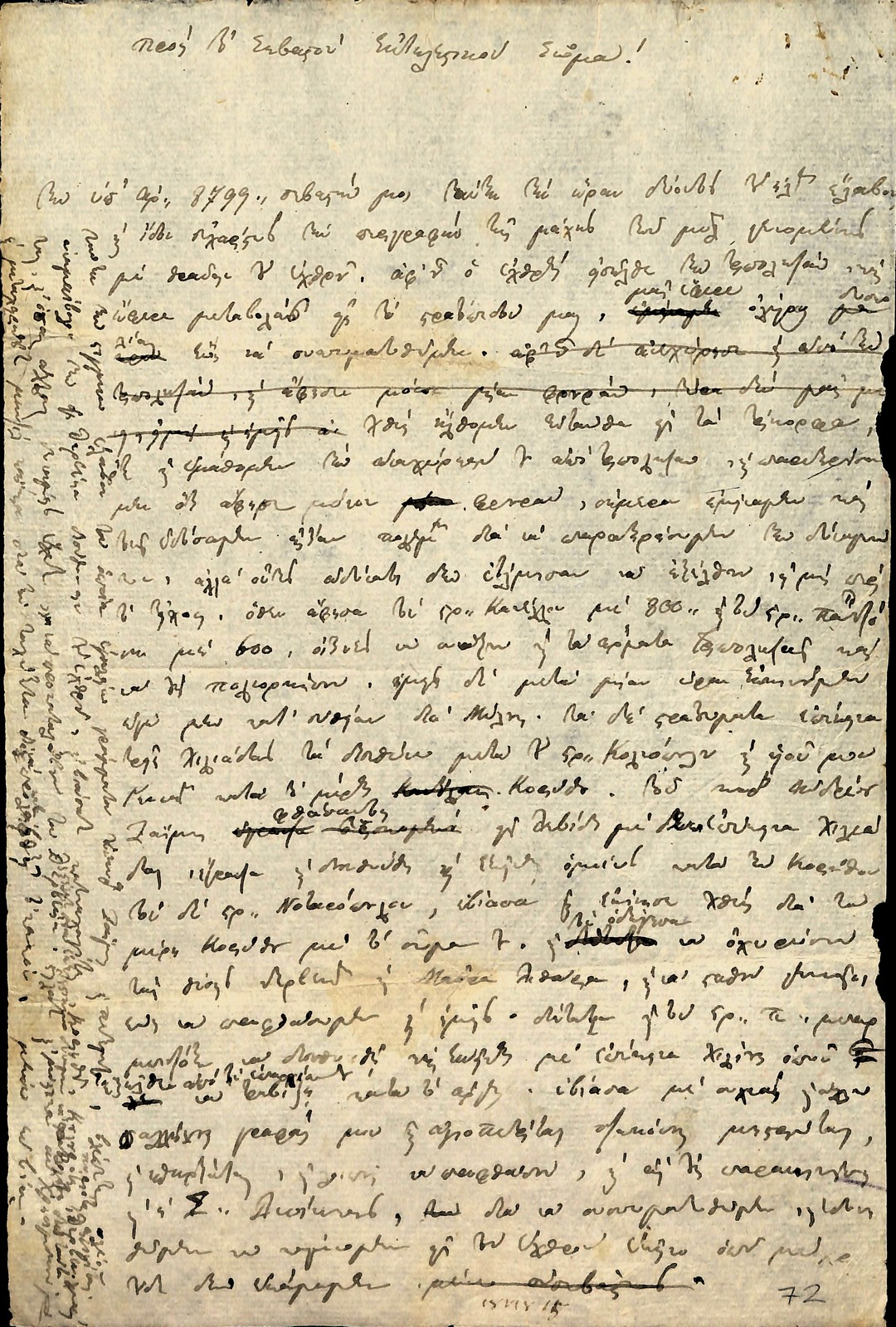 | Τίτλος | Επιστολή Στρατηγού Θεόδωρου Κολοκοτρώνη προς Π.Δ.Ε, Εκτελεστικό για την φρικτή λιποταξία χιλιάδων αγωνιστών, την δειλία του στρατεύματος που απέμεινε και την σοβαρή καθυστέρηση των στρατευμάτων του Μαυρομιχάλη |